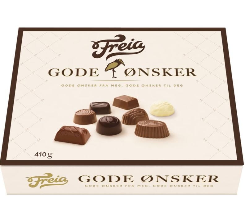 Freia Gode Ønsker er en herlig konfekteske med biter dekket av deilig melkesjokolade, hvit- og mørk sjokolade.