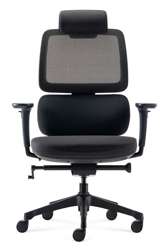 Den specielle vævning, i polyester uden polster, giver god støtte til den øvre del af ryggen samt en ventileret komfort. Hjulene er uden skærme og bliver dermed ikke stoppet af støv og snavs fra gulvet.