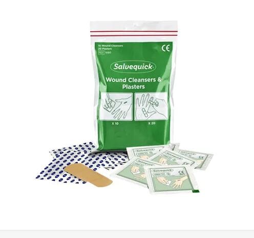 Praktisk pose med Salvequick Plaster (20 stk) og Savett Sårvask (10 stk).