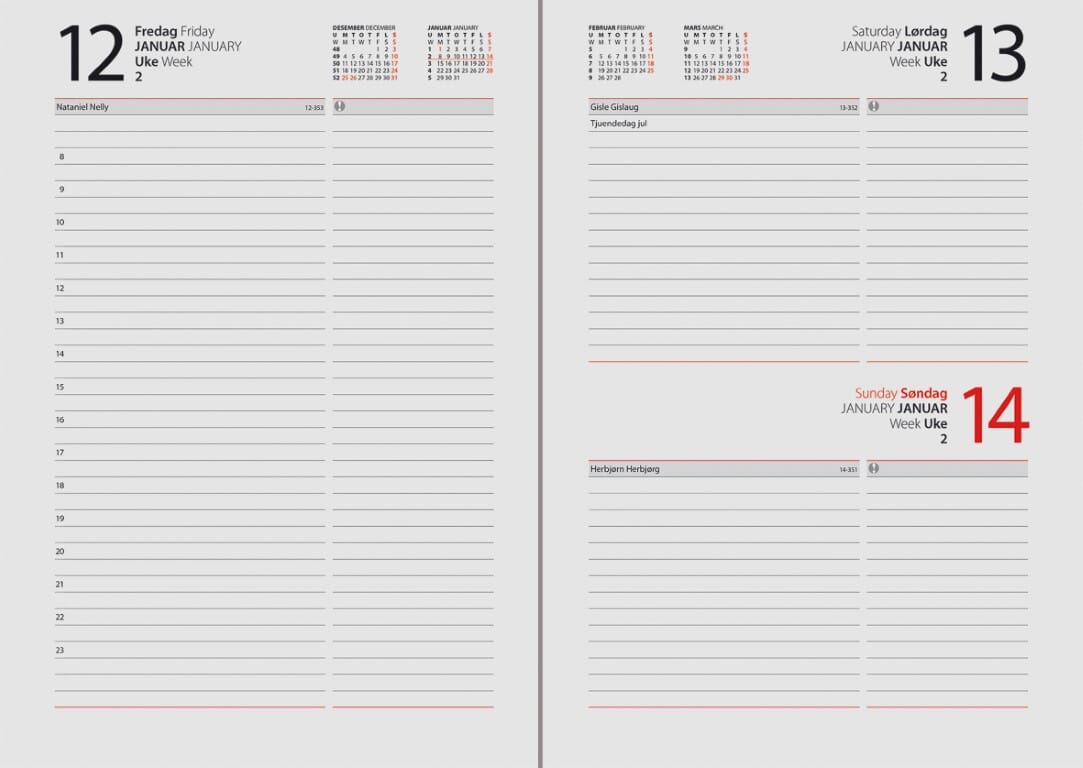 7.sans Dagbok er storselgeren hva gjelder avtalebok i A5 format. God kvalitet på omslag og innhold sikrer dine notater. Meget hendig å ha med seg. Veldig god plass for notater hver dag. Finnes i utallige versjoner. Fast innbundet eller spiralisert. Med eller uten utstansede månedstabber. Et utall av design og farger. Meget anvendelig for alle formål. Alle 7.sans produkter er miljøsertifisert etter anerkjente internasjonale standarder slik at de minst mulig påvirker vårt felles ytre miljø. Sidestørrelse: 14,8 x 21 cm A5 Hjørneperforering 70 gr papir En dag pr. side Norsk Klokkeslett fra-til: 08:00-23:00 Røde søndager og helligdager Årsoversikt innværende og neste år Månedoversikt inneværende og neste år Notatsider Norske navnedager Norske helligdager