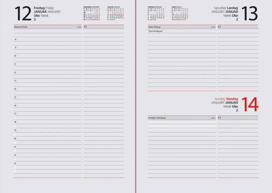 7.sans Dagbok er storselgeren hva gjelder avtalebok i A5 format. God kvalitet på omslag og innhold sikrer dine notater. Meget hendig å ha med seg. Veldig god plass for notater hver dag. Finnes i utallige versjoner. Fast innbundet eller spiralisert. Med eller uten utstansede månedstabber. Et utall av design og farger. Meget anvendelig for alle formål. Alle 7.sans produkter er miljøsertifisert etter anerkjente internasjonale standarder slik at de minst mulig påvirker vårt felles ytre miljø. Sidestørrelse: 14,8 x 21 cm A5 Hjørneperforering 70 gr papir En dag pr. side Norsk Klokkeslett fra-til: 08:00-23:00 Røde søndager og helligdager Årsoversikt innværende og neste år Månedoversikt inneværende og neste år Notatsider Norske navnedager Norske helligdager