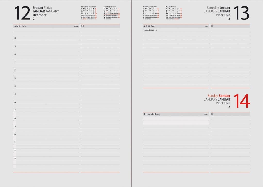 7.sans Dagbok er storselgeren hva gjelder avtalebok i A5 format. God kvalitet på omslag og innhold sikrer dine notater. Meget hendig å ha med seg. Veldig god plass for notater hver dag. Finnes i utallige versjoner. Fast innbundet eller spiralisert. Med eller uten utstansede månedstabber. Et utall av design og farger. Meget anvendelig for alle formål. Alle 7.sans produkter er miljøsertifisert etter anerkjente internasjonale standarder slik at de minst mulig påvirker vårt felles ytre miljø. Sidestørrelse: 14,8 x 21 cm A5 Hjørneperforering 70 gr papir En dag pr. side Norsk Klokkeslett fra-til: 08:00-23:00 Røde søndager og helligdager Årsoversikt innværende og neste år Månedoversikt inneværende og neste år Notatsider Norske navnedager Norske helligdager