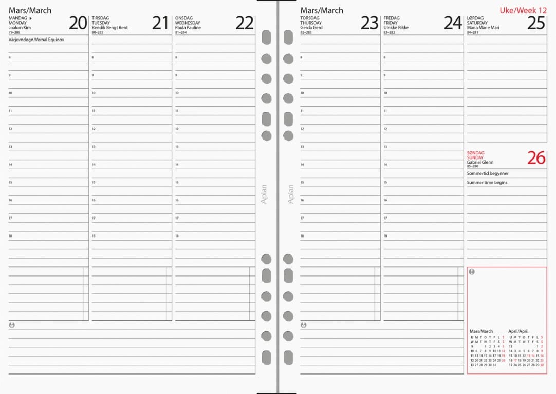 Praktisk års-sett for din Aplan perm.Unihulling gjør at det passer i de fleste permer, også Filofax samt Grieg, Alle papirbaserte Aplan produkter er miljøsertifisert etter anerkjente internasjonale standarder slik at de minst mulig påvirker vårt felles ytre miljø. Sidestørrelse: 14,8 x 21 cm Hullet for Aplan 70 gr papir En uke på to sider Norsk Klokkeslett fra-til: 08:00-18:00 2 farger sort og rød i kalender Årsoversikt innværende og neste år Månedoversikt inneværende og neste år Notatsider 16 siders atlas Norske navnedager Norske helligdager