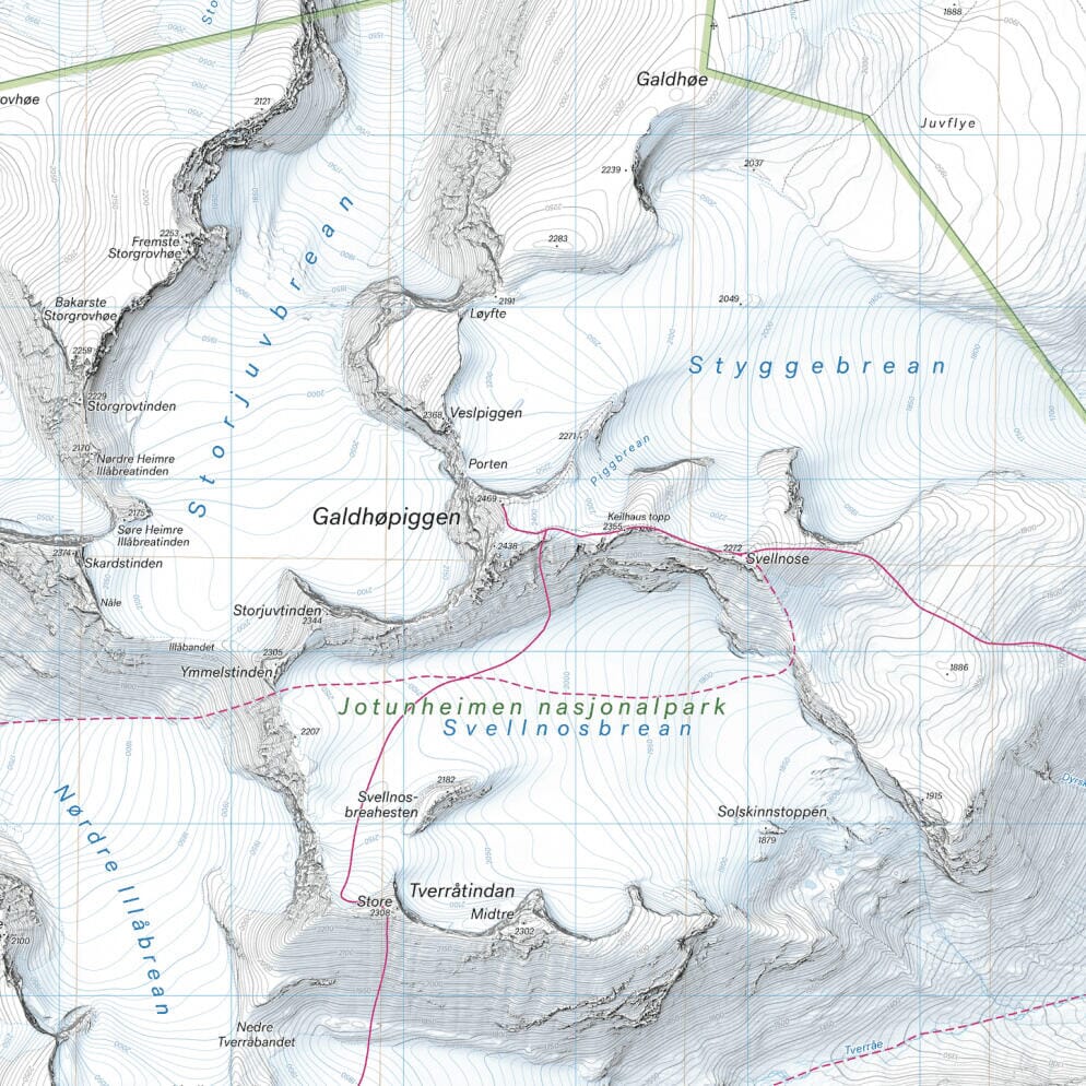 Kartet beskriver Jotunheimen svært detaljert, og skaper gode forutsetninger for alpine toppturer.