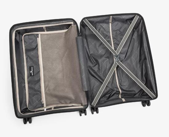 - Fire 360° stillegående og støtdempende spinner hjul - To bærehåndtak og teleskopisk trekkhåndtak - Undersiden formet som et håndtak- Interiør: en side med elastisk tverrbånd, en side med glidelåslomme og en mindre nettinglomme med glidelås.