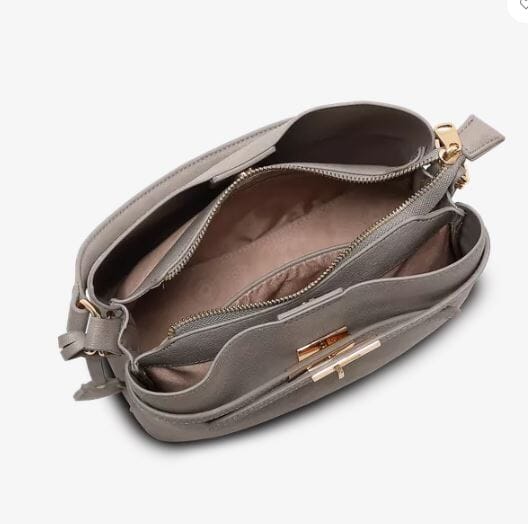 Vesken har åpne hovedrom med magnetlås samt et lukket midtfack med glidelås. Står stødig på metallføtter og kan bæres både i hånden, på skulderen eller som crossover.