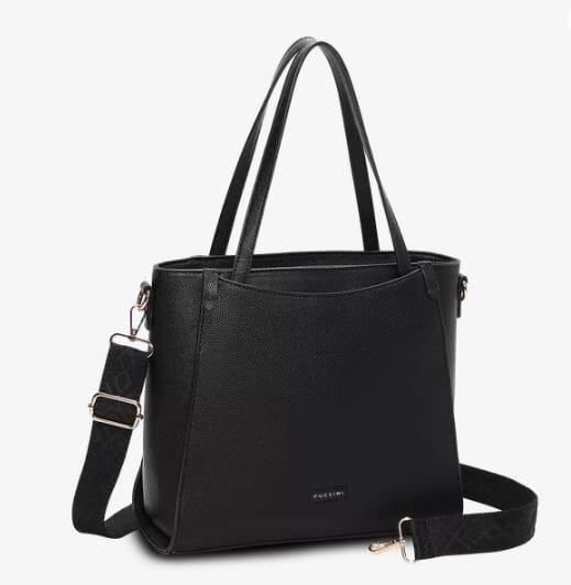 Romslig håndveske fra Puccini i moderne design, laget av skinnimitasjon med to ulike strukturer som gir vesken et eksklusivt og oppdatert uttrykk.