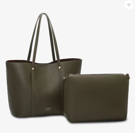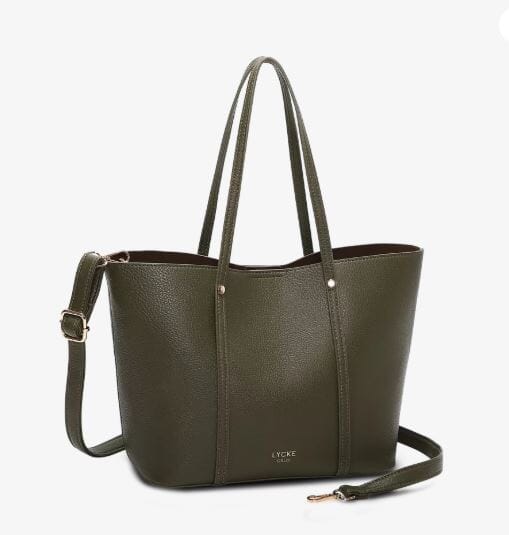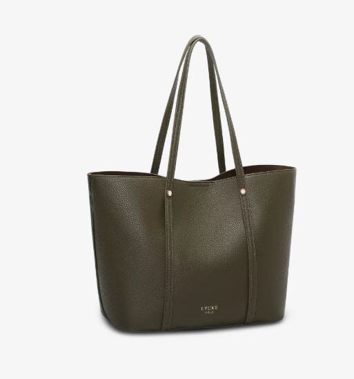 Elegant håndveske i to-i-en-modell fra Lycke Oslo, laget av skinnimitasjon med vakre gulldetaljer.