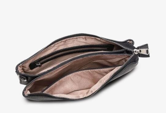 To hovedrom gir god oversikt, og vesken kan brukes på skulderen, crossbody eller i hånden som en stor clutch.