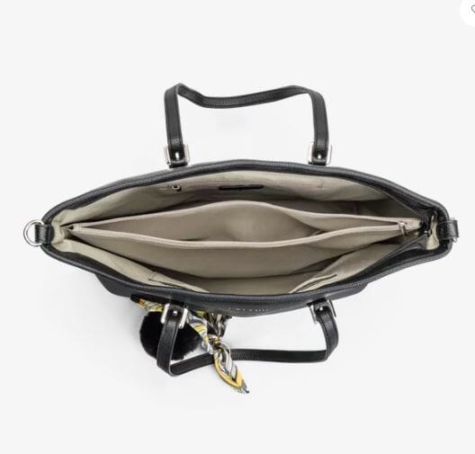Vesken lukkes med glidelås på toppen. På innsiden finner du to store åpne rom, to mindre åpne lommer og to glidelåslommer.