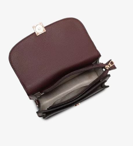 Boxy klaffmodell med gull-detaljer gir et elegant uttrykk. Klaff med magnetlås og hovedrom med glidelås.
