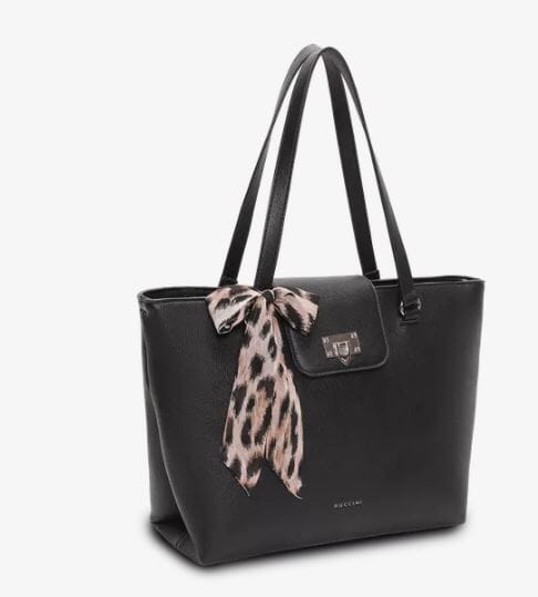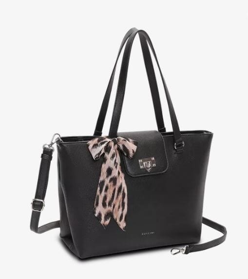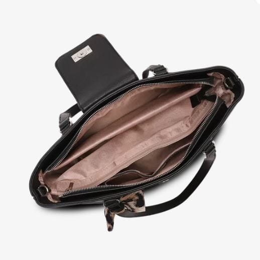 Vesken får et trendy uttrykk med sitt avtagbare leopardmønstrede skjerf, samtidig som de rene linjene, det elegante spennet og de gjennomarbeidede detaljene gir et sofistikert og eksklusivt preg som løfter enhver antrekk.