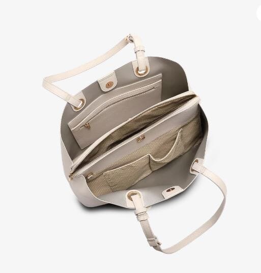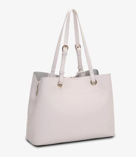 Klassisk skandinavisk design med gulldetaljer for deg som ønsker et rent og elegant uttrykk. Hovedrommet har magnetlås og et lett vattert midtrom med glidelås for 14" datamaskin. Elegant, avtakbar hengedekorasjon følger med.