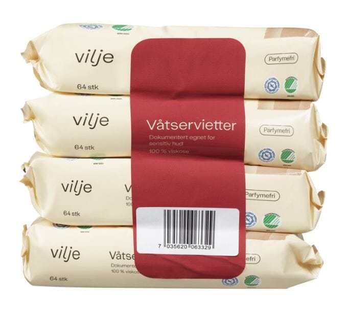 Vilje våtservietter er milde og parfymefrie. De tykke og gode serviettene er laget av 100% viskose som