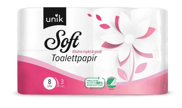 Trelags toalettpapir fremstilt av 100 % nyfiber.
