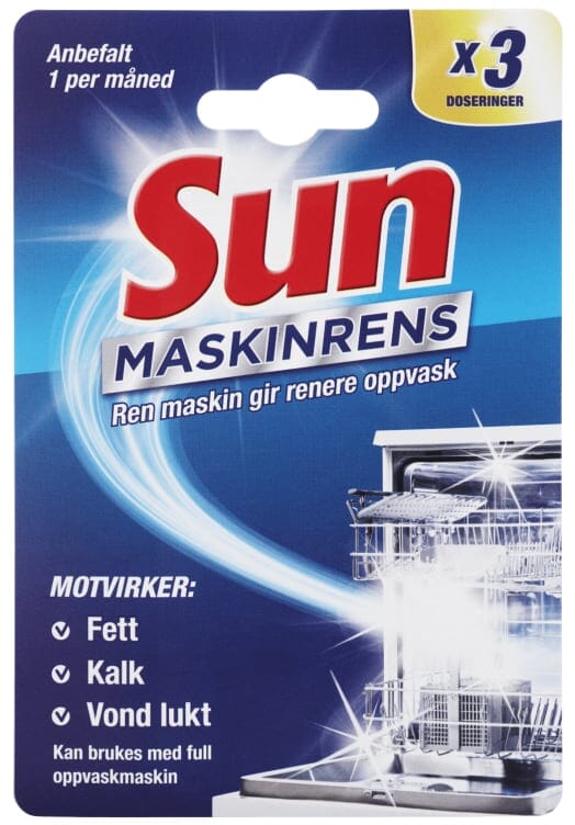 Sun Maskinrens gjør maskinen skinnende ren og motvirker vond lukt, fett og kalk.
