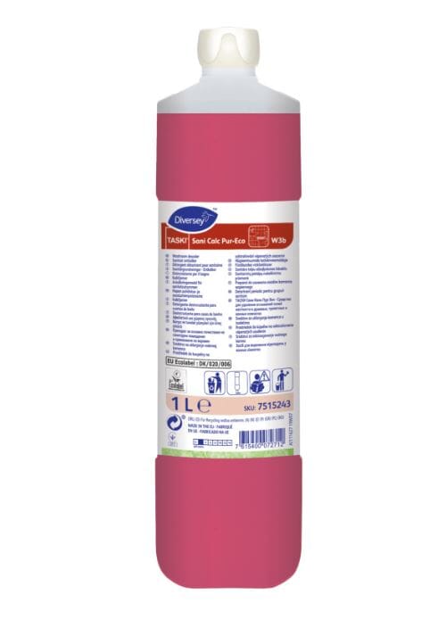 Miljømerket, surt middel med farge og parfyme, til periodisk kalkfjerning og rengjøring av sanitærrom. Etikett med piktogram og flerspråklig forklaring for korrekt bruksforståelse. pH ca. 2.